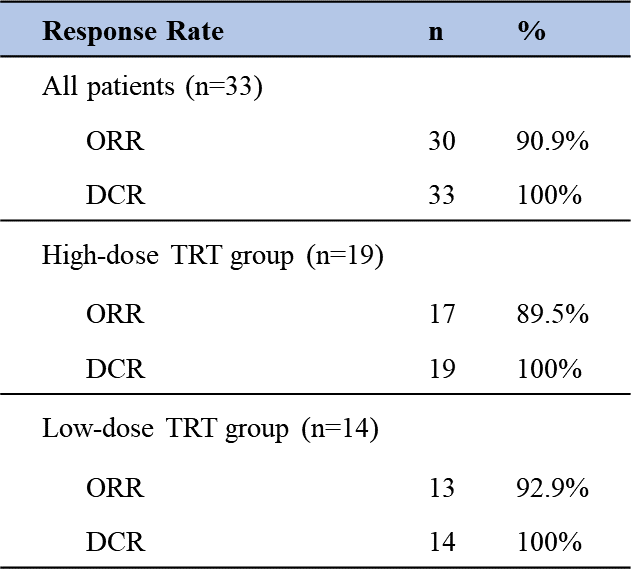 在33例患者中,19例患者接受高剂量TRT(>3Gy*10f或≥2Gy*25f),14例患者接受低剂量TRT(≤3Gy*10f或<2Gy*25f)。阿得贝利单抗联合化疗序贯胸部放疗一线治疗广泛期小细胞肺癌患者显示出良好的数据:ORR达90.9%,这意味着10个ES-SCLC患者中就有9个患者可以获得疾病客观缓解。DCR达100%。根据目前公布的研究数据,接受高剂量TRT组的患者和接受低剂量TRT组的患者疗效上没有显著差异,ORR分别为89.5%和92.9%;DCR都可达100%。